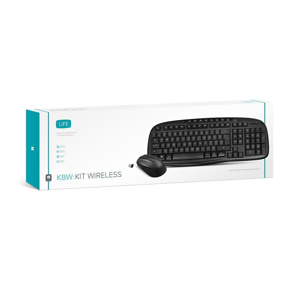 1Life kbw:flow kit é uma solução sem fios. Conjunto de escritório que inclui um rato ótico de 1000dpi e um teclado com 8 teclas de atalho.