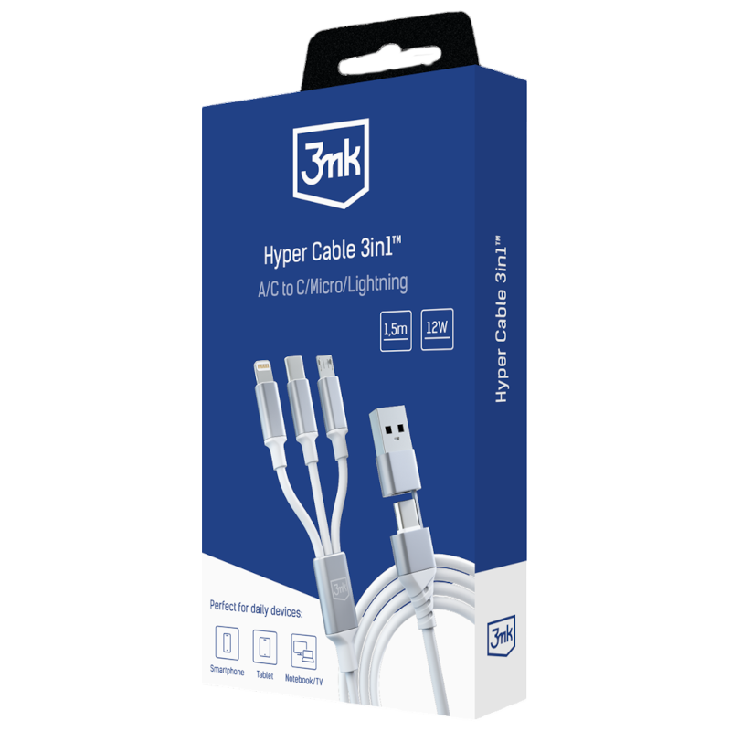 Compatível com uma ampla gama de gadgets modernos, o 3MK Hyper Cable 3 Em 1 oferece três conectores em um único design, eliminando a necessidade de múltiplos cabos.
