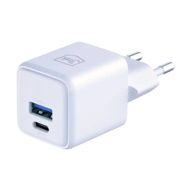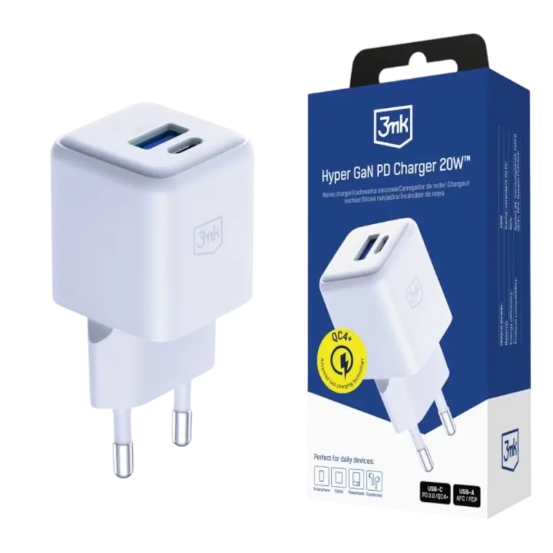 O 3MK Hyper GaN PD Charger 20W é um carregador compacto e potente, ideal para carregamento rápido do smartphone.