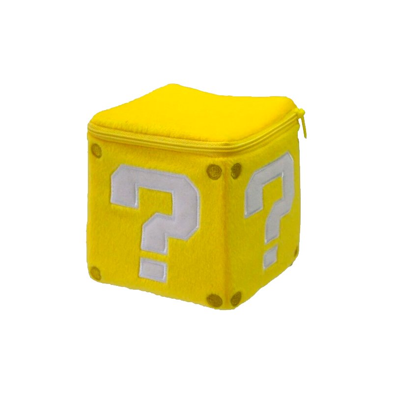 Almofada de peluche de aproximadamente 13 cm de altura do bloco de moedas que geralmente aparece em jogos de vídeo Super Mario.
