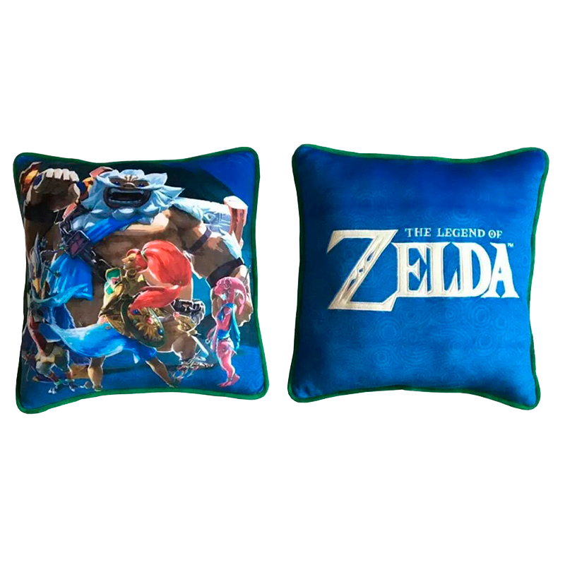 Almofada The Legend of Zelda, tamanho 40 cm. Ilustração do logotipo de The Legend of Zelda de um lado e Champions Zelda do outro.
