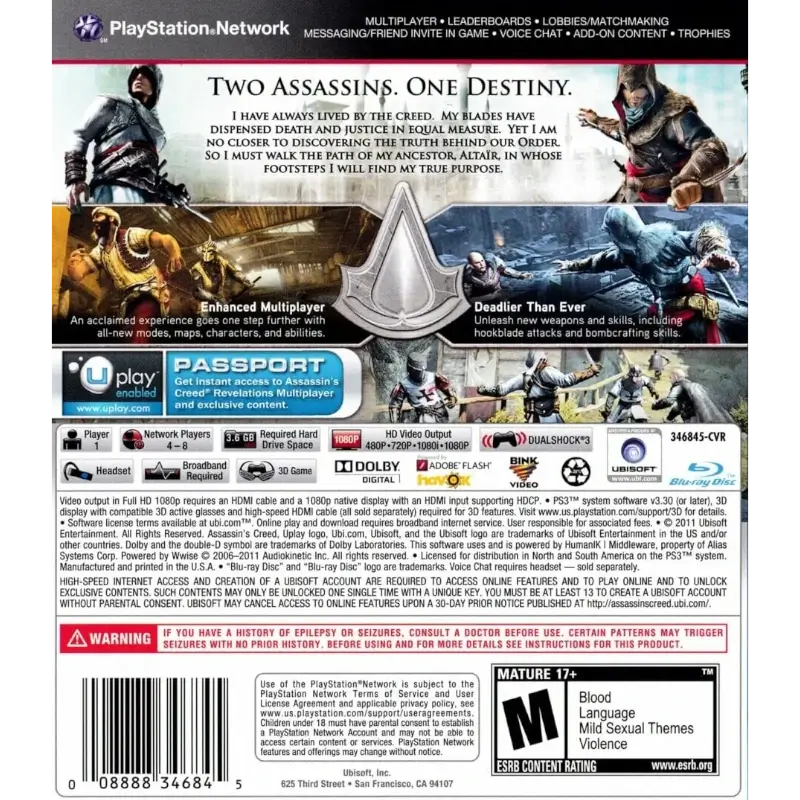 Assassin’s Creed: Revelations é uma entrada na série histórica com um ambiente de mundo aberto e foco em jogabilidade furtiva. Assim que Desmond Miles é forçado a esfaquear seu aliado, ele entra em coma. Ele então retorna ao Animus para manter sua consciência. Uma vez no Animus, ele cai em uma porta dos fundos conhecida como Black Room. Lá ele espera remontar sua mente fragmentada, para acordar de seu coma. Ele pode fazer isso conectando sua mente localizando uma memória chave. Ao longo do caminho para fazer isso, ele começa a reviver as memórias posteriores de Ezio. O novo Grão-Mestre da Ordem dos Assassinos, depois de libertar a Itália da ameaça dos Templários, questiona sua vida como um Assassino, imaginando como teria sido se ele nunca tivesse sido um. Ezio então parte em uma peregrinação à terra natal de seu predecessor, Masyaf, que ele descobre ter sido invadida pelos Templários. Lá ele encontra um artefato antigo, que está trancado e só pode ser aberto com cinco chaves. A busca por esses selos o leva até Constantinopla, onde descobre que há um exército de Templários se formando na cidade, ameaçando desestabilizar a região. Ezio deve seguir os passos de seu mentor espiritual, Altair, para conduzi-lo à descoberta e revelação.