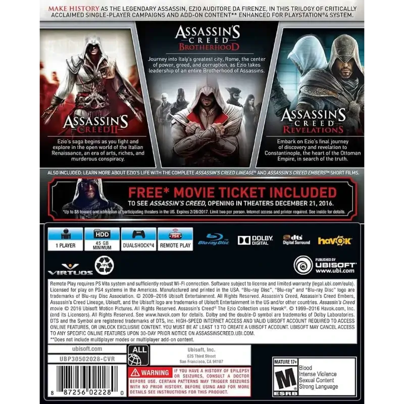 Com ASSASSIN’S CREED THE EZIO COLLECTION PS4, tens acesso a Assassin’s Creed II, Assassin’s Creed Brotherhood e Assassin’s Creed Revelations, todos com melhorias gráficas adaptadas à PS4. ASSASSIN’S CREED THE EZIO COLLECTION PS4 oferece exploração em mundo aberto, combate fluido, parkour e uma narrativa profunda ambientada em cidades históricas como Florença, Veneza, Roma e Constantinopla.