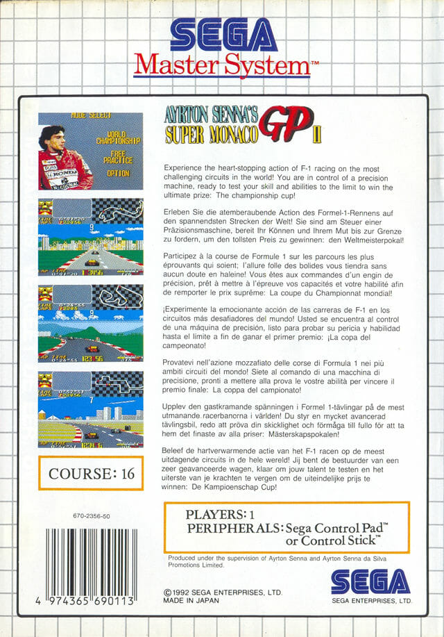 Ayrton Senna ganhou o Grande Prémio do Mónaco seis vezes, bem como 3 campeonatos mundiais de Fórmula 1, pelo que foi o homem perfeito para licenciar uma sequela em casa do clássico jogo de corridas de arcada. Como antes, a acção é vista de dentro do cockpit, mas retratada usando sprites em vez de polígonos.