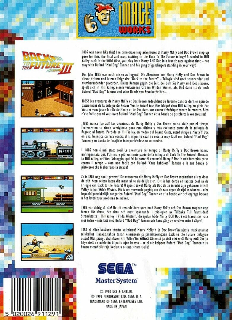 Back to the Future III é uma colecção de quatro jogos arcade. Marty McFly e Doc Brown viajaram no tempo até ao ano de 1885 – e em breve estão em apuros quando enfrentam o bando do “Mad Dog” Tannen e têm de encontrar uma forma de regressar ao presente. Este jogo pega em quatro cenas do filme de Hollywood Back to the Future III e transforma-as em sequências de arcada: