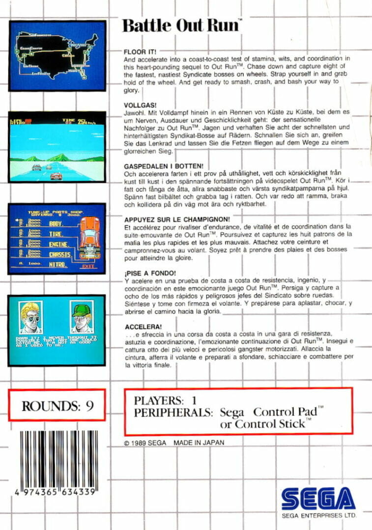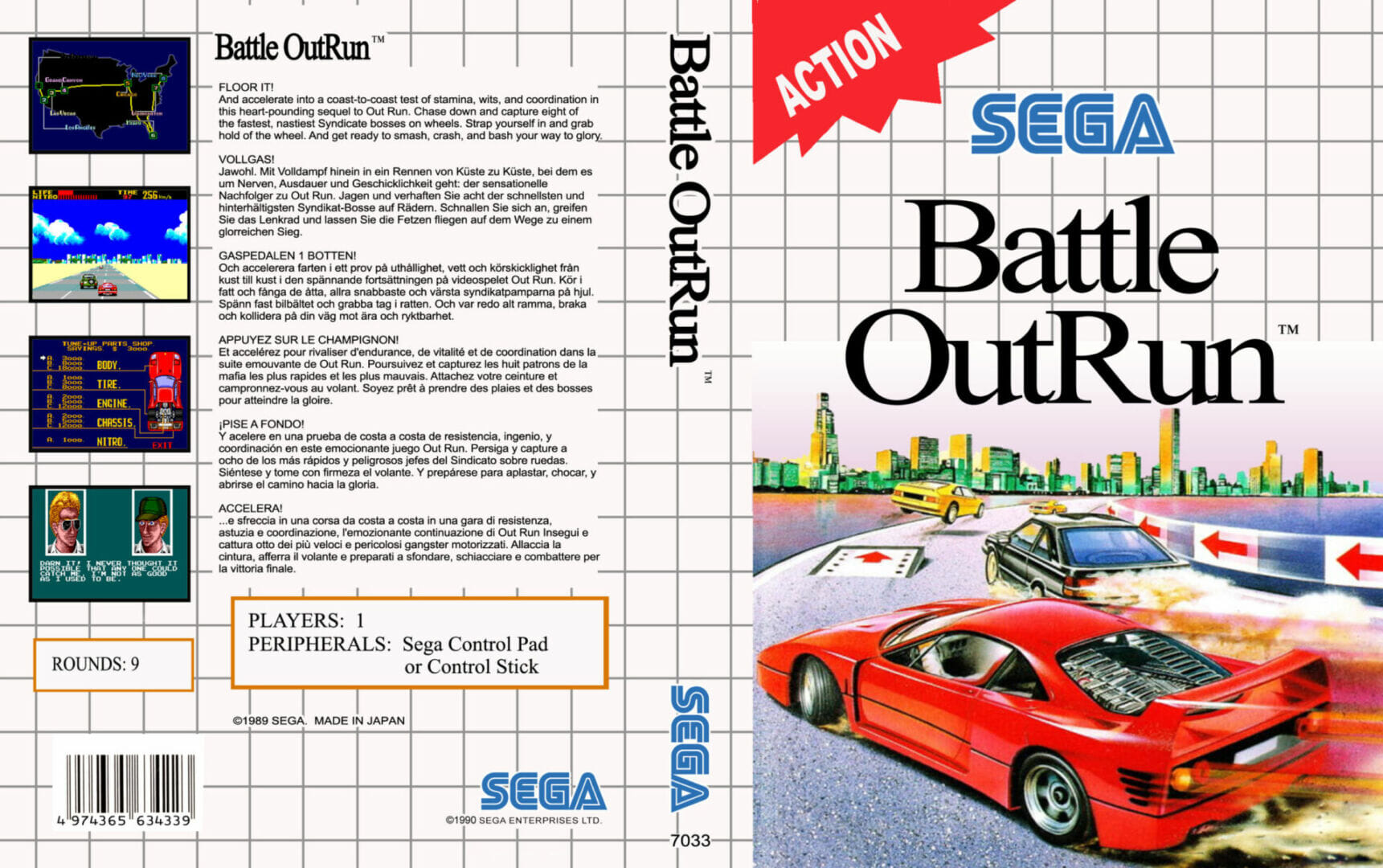 Battle Out Run é a resposta da Sega ao Taito’s Chase H.Q. Conduz um carro desportivo vermelho e tem de apreender oito veículos-alvo em cidades seleccionadas dos EUA, incluindo Los Angeles, Chicago, Miami, e Nova Iorque.