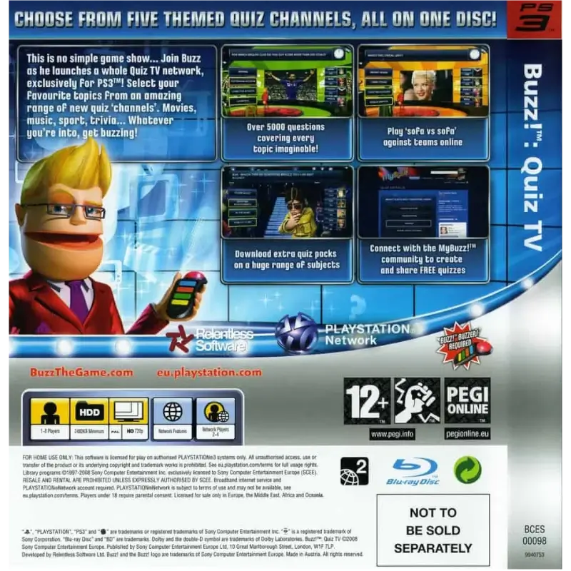 O Buzz! preferido de todos vai para a próxima geração, com o anfitrião, os concorrentes e o estúdio a receberem uma remodelação em alta definição. Este é o primeiro título de Buzz! com jogo online: o mundo inteiro torna-se um programa de quiz à medida que se vai online para comparar os seus conhecimentos de quiz com os melhores em oferta. Mergulhando num vasto conjunto de conteúdos descarregáveis e gerados pelo utilizador Buzz! A Quiz TV dá-lhe acesso a uma grande variedade de perguntas. A Quiz TV permite-lhe escolher entre canais de quiz que atraem de todos os mundos do Desporto, Cinema & TV, Conhecimento, Estilo de Vida e Música.