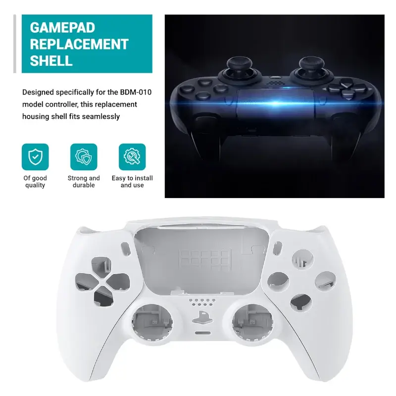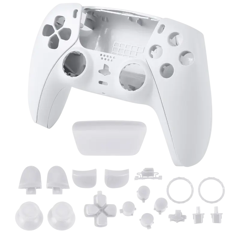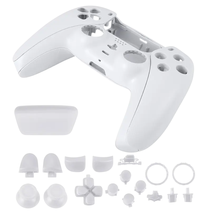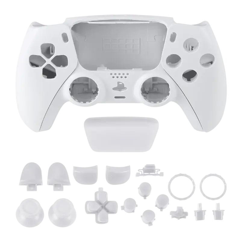 A Carcaça com Botões de Comando Dualsense PS5 BDM-010 na cor branca apresenta um design moderno e ergonômico, projetado para oferecer conforto durante longas sessões de jogo. A parte frontal da carcaça é predominantemente branca, com um acabamento suave e elegante, destacando-se pelo seu visual limpo e minimalista, característico da estética do PlayStation 5.