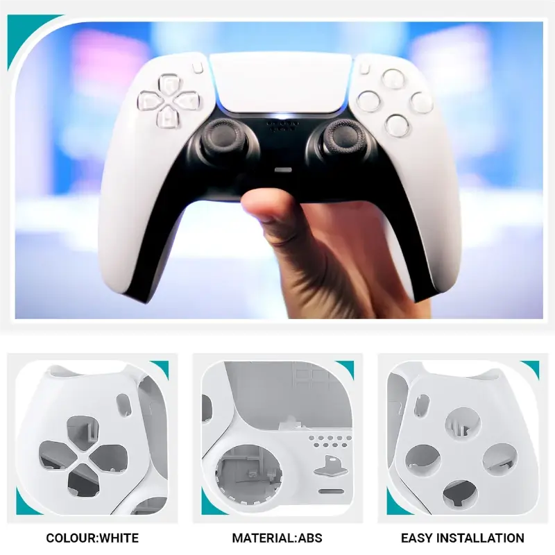 Além disso, o design ergonômico da carcaça é pensado para se adaptar naturalmente às mãos, com curvas suaves e uma disposição de botões intuitiva. Esta carcaça branca reflete a estética futurista e minimalista da PlayStation 5, mantendo a funcionalidade e o conforto que são marcas registadas da linha DualSense.
