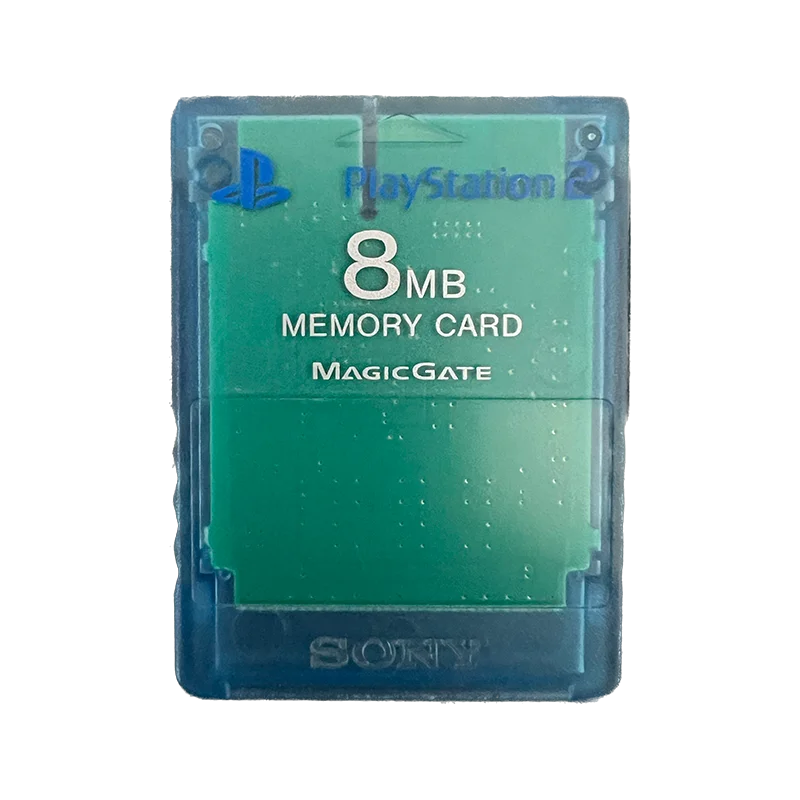 O cartão de memória Oficial padrão da PlayStation 2 tem capacidade de 8 megabytes (MB)e possui criptografia MagicGate.
