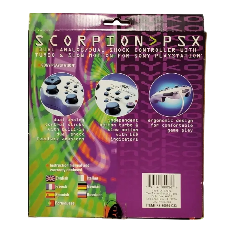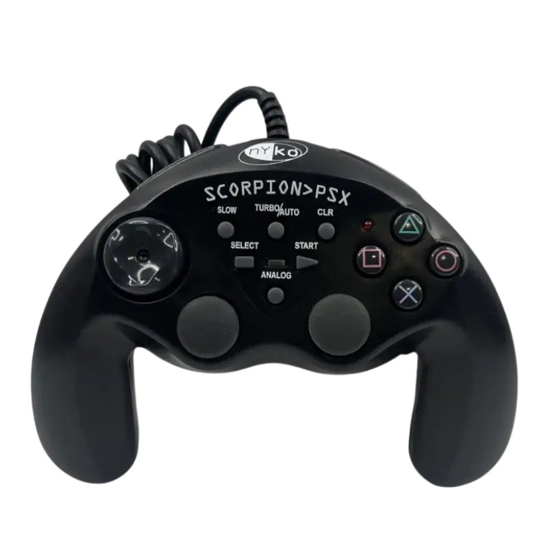 O Comando Nyko Scorpion PSX é um comando projetado especificamente para a PlayStation original, apresentando um design arrojado e robusto que reflete a estética clássica dos anos 90. Na sua versão em preto, o dispositivo tem um visual elegante e discreto, com uma estrutura ergonômica que se adapta confortavelmente às mãos, proporcionando uma experiência de jogo fluida e agradável.