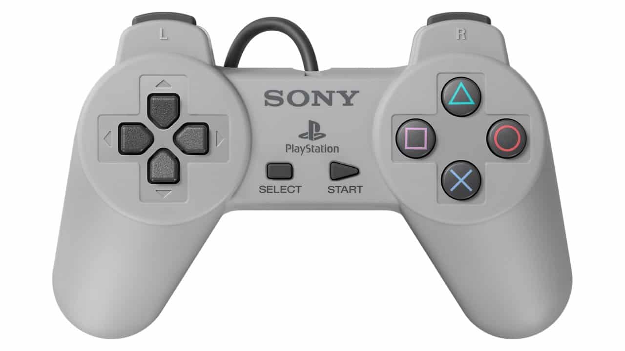 O comando foi projetado por Teiyu Goto e baseado no da SNES, adicionando dois botões de ombro L2 e R2 e alças para melhorar a ergonomia do controle, nos botões de face, ao invés de utilizar números, foi utilizados símbolos círculo, X, quadrado e triângulo. Originalmente o círculo representaria sim, o X representaria o não, o quadrado representaria os menus e o triângulo representaria o ângulo de visão.[1]