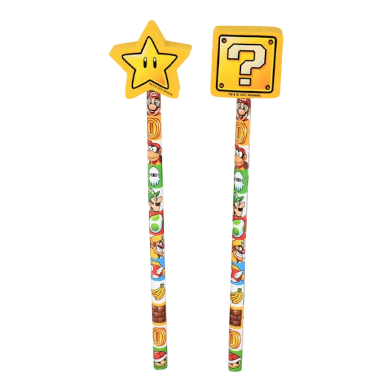 As borrachas incluídas complementam o conjunto, destacando-se pelo seu design inspirado no mundo do Super Mário, podendo apresentar personagens ou símbolos icónicos do jogo. Feitas com um material macio e eficaz, removem marcas de lápis com facilidade, sem danificar o papel.