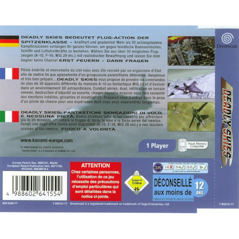 O Deadly Skies DC é um emocionante simulador de combate aéreo lançado para o Dreamcast, que transporta os jogadores para intensas batalhas nos céus com uma atmosfera repleta de ação. Desenvolvido para explorar ao máximo as capacidades gráficas e de processamento da consola da Sega, o jogo impressiona pelos detalhes visualmente apurados nas aeronaves e nos cenários, desde montanhas e oceanos a cidades e bases militares. A jogabilidade é desafiante e intensa, exigindo reflexos rápidos e estratégia para controlar as aeronaves e derrubar os inimigos.