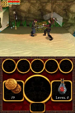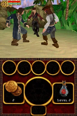 Os jogadores controlam todos os três heróis do filme, Capitão Jack Sparrow, Will Turner e Elizabeth Swann neste jogo de ação e aventura em terceira pessoa para o Nintendo DS. O jogo leva os jogadores a muitos locais memoráveis apresentados no filme, incluindo Cingapura, Davy Jones ‘Locker, Shipwreck Cove e até mesmo dentro do próprio Flying Dutchman. Além do combate fanfarrão e da navegação acrobática pelo mundo, os jogadores usam a tela sensível ao toque para destravar baús e portas.