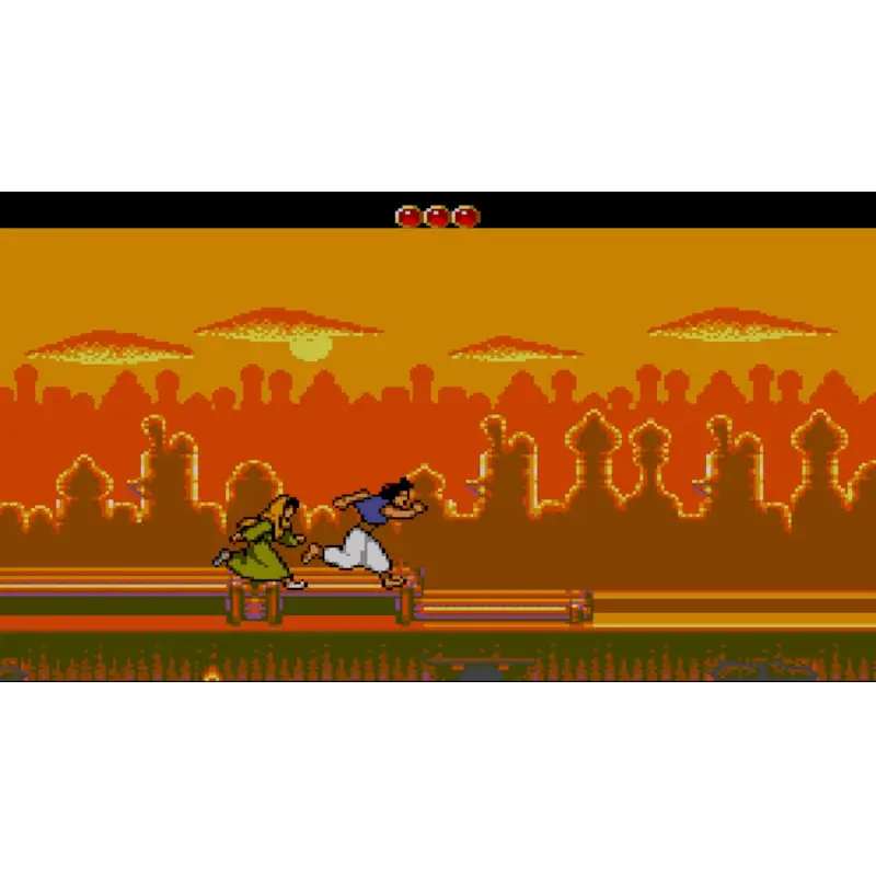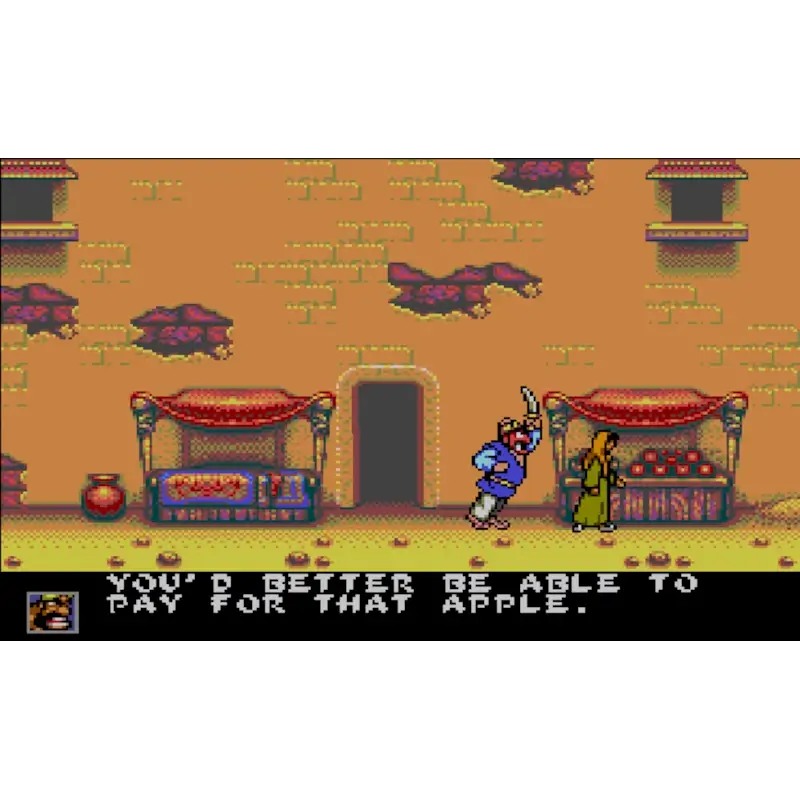 Jogabilidade: Aladdin pode saltar, lançar maçãs contra inimigos e usar a sua agilidade para evitar perigos.