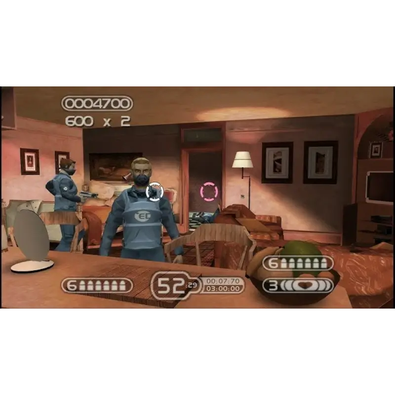 Endgame para PlayStation 2 é um shooter on-rails cheio de ritmo, pensado para ser jogado com o comando ou com pistolas compatíveis com a consola. A ação é frenética: o jogo avança automaticamente pelos cenários e tu tens de reagir rapidamente aos inimigos que surgem no ecrã, disparando, recarregando e tentando sobreviver à chuva de tiros. A história envolve uma conspiração tecnológica num futuro próximo, onde deves impedir que um sistema de vigilância global seja ativado. O foco está totalmente na ação — explosões constantes, perseguições e ritmo acelerado — oferecendo uma experiência arcade pura, simples e direta, típica dos jogos de tiro que dominavam as salas de jogos.