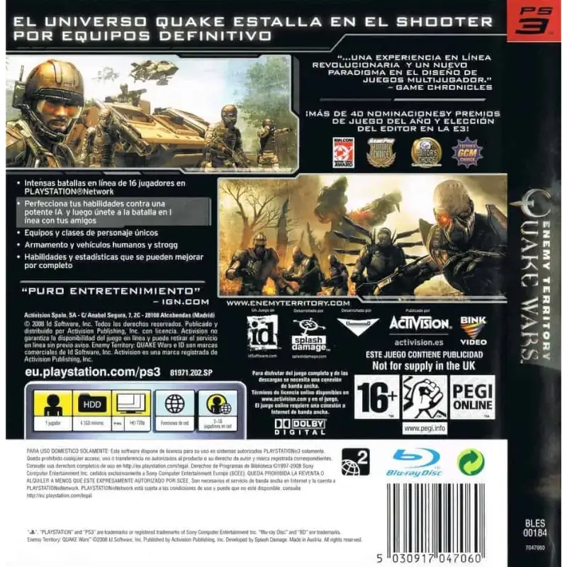 Enemy Territory: Quake Wars PS3 é um jogo de ação em primeira pessoa focado em combate tático em equipa, ambientado num conflito futurista entre humanos e a raça alienígena Strogg. Em Enemy Territory: Quake Wars PS3, os jogadores participam em batalhas estratégicas, assumindo papéis específicos dentro de classes de combate para cumprir objetivos essenciais no campo de batalha.