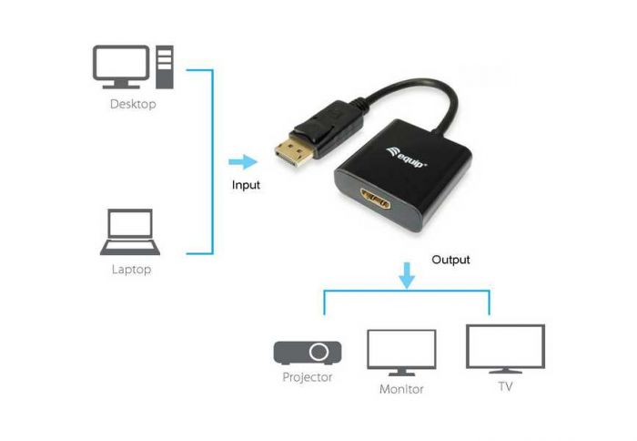 O conjunto conversor DisplayPort para HDMI equip® vem com um cabo + conversor, permitindo que você conecte um monitor HDMI a uma fonte de vídeo Display, eliminando a necessidade de atualizar seu monitor para compatibilidade de exibição.O conjunto conversor DisplayPort para HDMI equip® vem com um cabo + conversor, permitindo que você conecte um monitor HDMI a uma fonte de vídeo Display, eliminando a necessidade de atualizar seu monitor para compatibilidade de exibição.