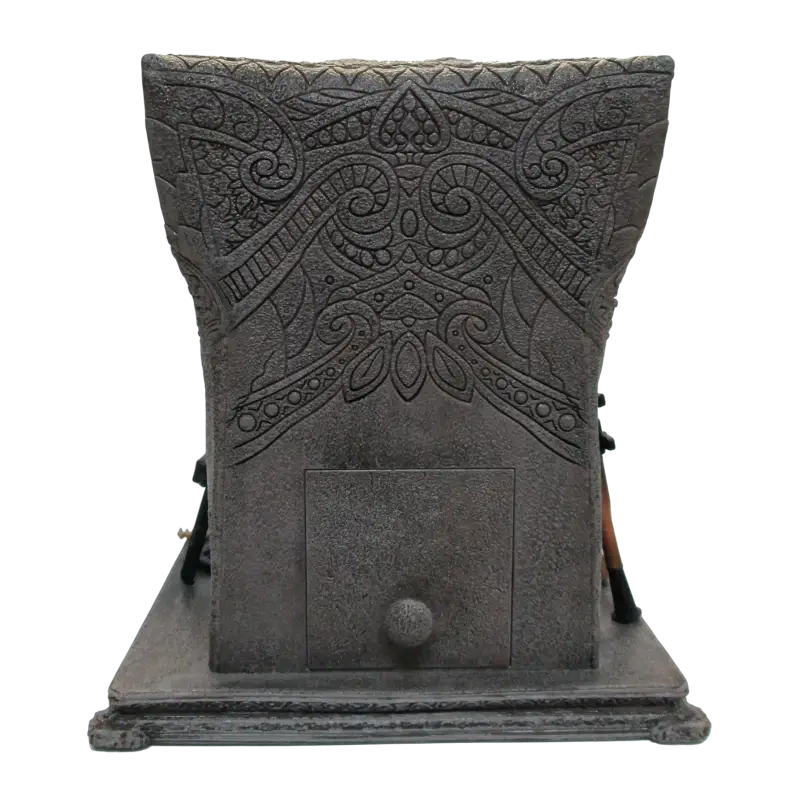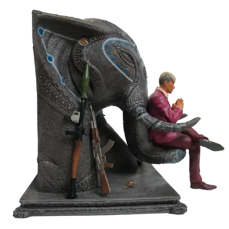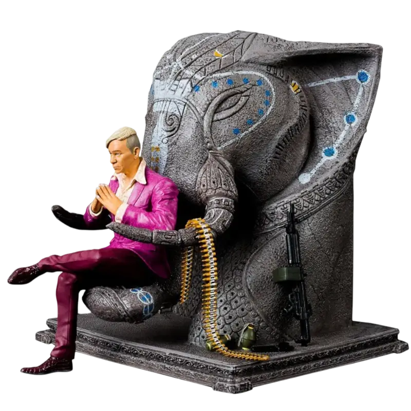 O trono, ricamente decorado, é adornado com esculturas de elefantes e padrões inspirados na arte tradicional asiática, reforçando a simbologia de poder e domínio de Pagan Min sobre Kyrat. Cada detalhe, desde as texturas do vestuário até às marcas no trono, foi meticulosamente esculpido e pintado para oferecer um acabamento realista e de alta qualidade.