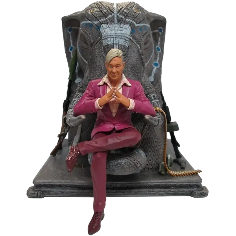 ESTÁTUA FAR CRY 4 PAGAN MIN ELEPHANT THRONE. Inspirada na estética exótica e opulenta do reino fictício de Kyrat, esta estátua captura todos os detalhes do carismático e imprevisível vilão, desde a sua expressão confiante até ao seu fato rosa característico.