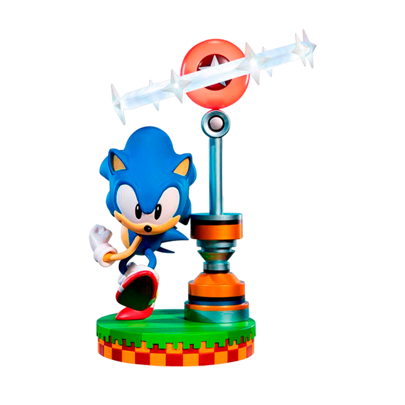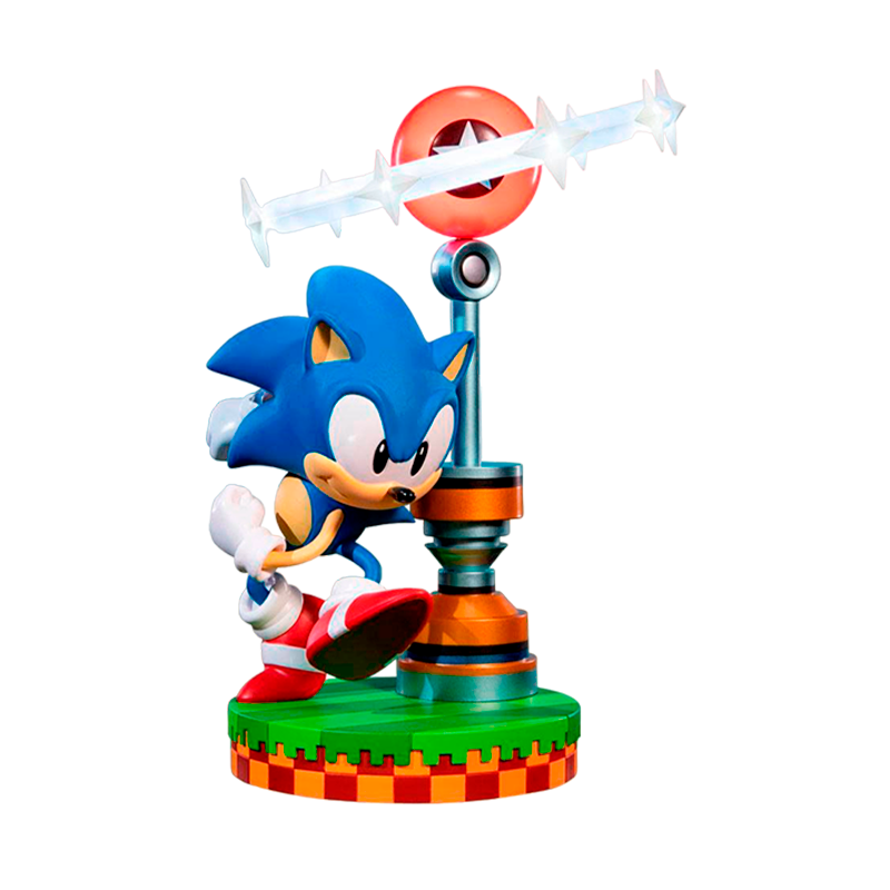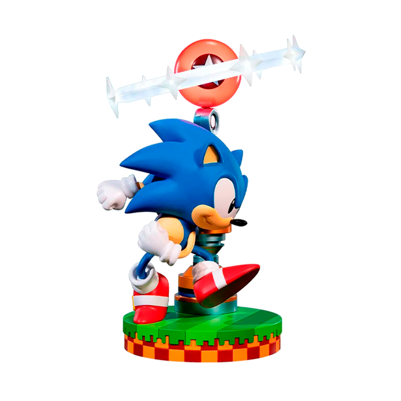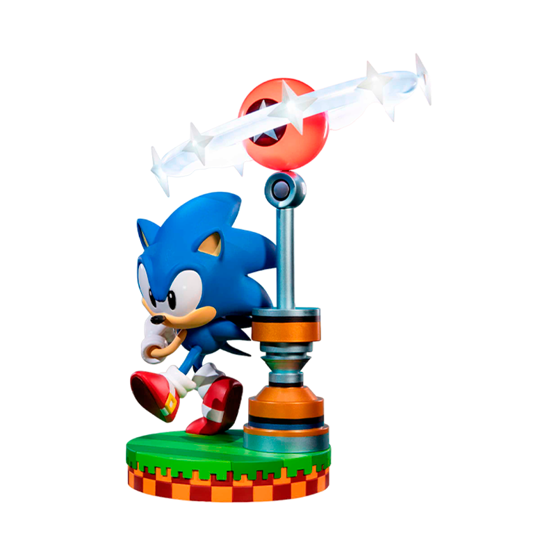 A estátua altamente detalhada de Sonic the Hedgehog é vista fazendo uma pose dinâmica, acelerando para correr mais rápido que a velocidade do som. O design da base é inspirado na Green Hill Zone, e nela também está o posto de controle Star Post, que você pode girar até 90 graus, permitindo vários ângulos de visão.
