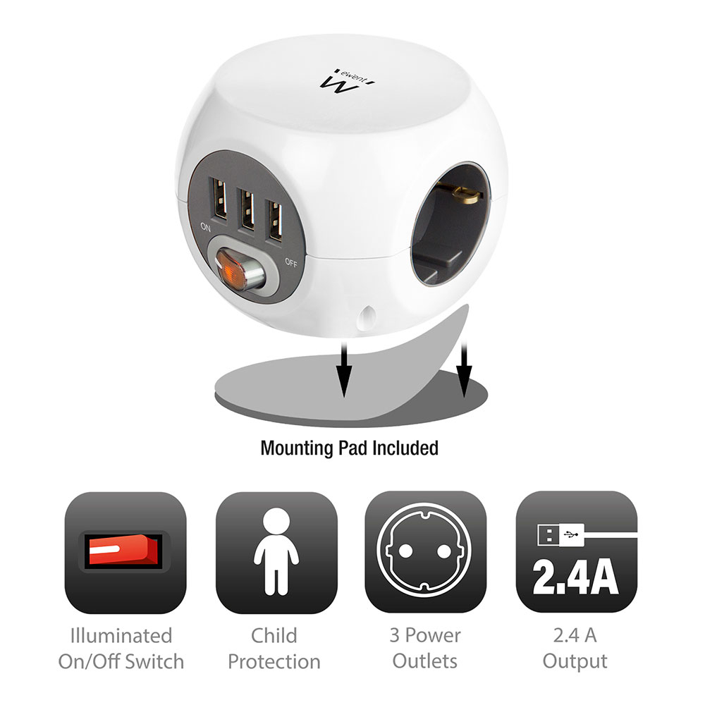 Forneça energia aos seus dispositivos com o bloco de tomadas EW3938. Pode ligar 3 dispositivos elétricos e 3 dispositivos USB em simultâneo. As portas USB fornecem 2.4A e estão equipadas com proteção contra curto-circuito e sobrecarga. As três tomadas estão equipadas com proteção para crianças. Coloque o bloco de tomadas facilmente na sua secretária com o suporte de montagem. Este suporte de montagem impede que o bloco de tomadas deslize da secretária. Ligue ou desligue todos os dispositivos ligados em simultâneo com o interruptor iluminado.