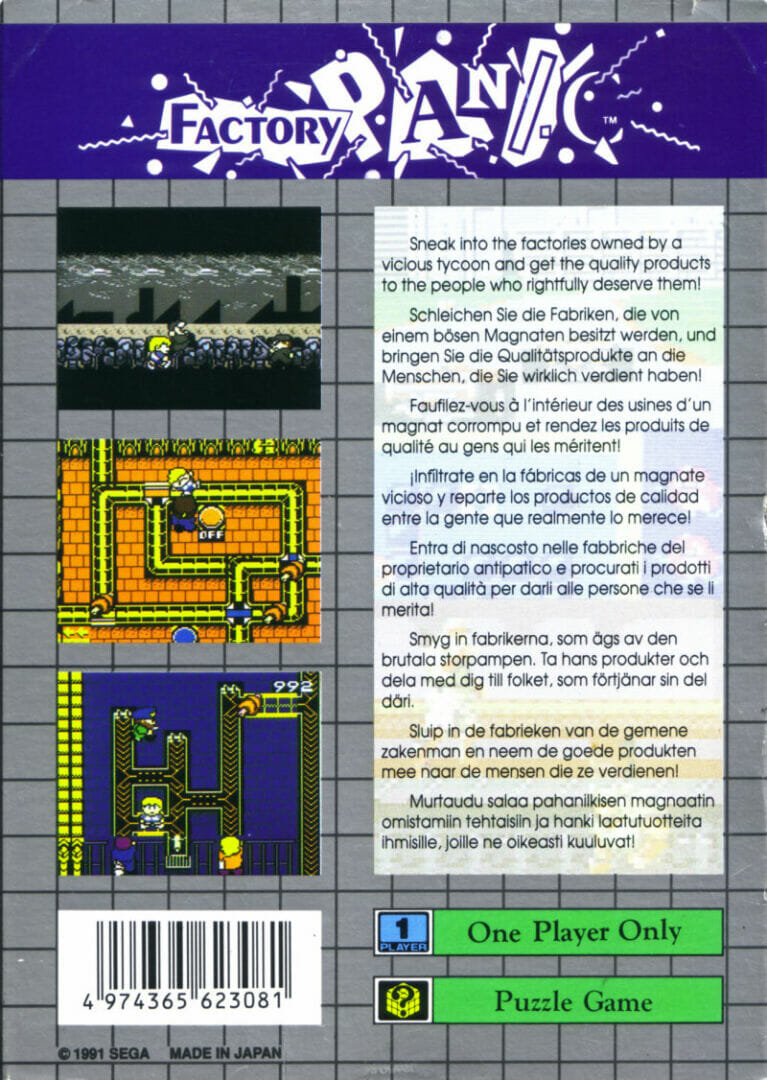 O Factory Panic consiste em quatro rondas, e cada ronda consiste em oito fases. Antes de uma etapa começar, o jogo diz-lhe quantas pessoas estão à espera na fila e de que produto estão à espera. As rondas um e três são jogadas em “Switch Mode”: pisar em diferentes interruptores para rodar secções associadas da esteira transportadora. Se sair do interruptor, a secção roda de volta à sua posição inicial. Um interruptor pode afectar mais do que uma secção. Uma vez que só se pode pisar num interruptor de cada vez, é necessário agitar bastante em fases posteriores. As rondas dois e quatro são jogadas no “Modo Ponte”: remover e instalar pequenas pontes entre as correias para controlar o fluxo de produtos.