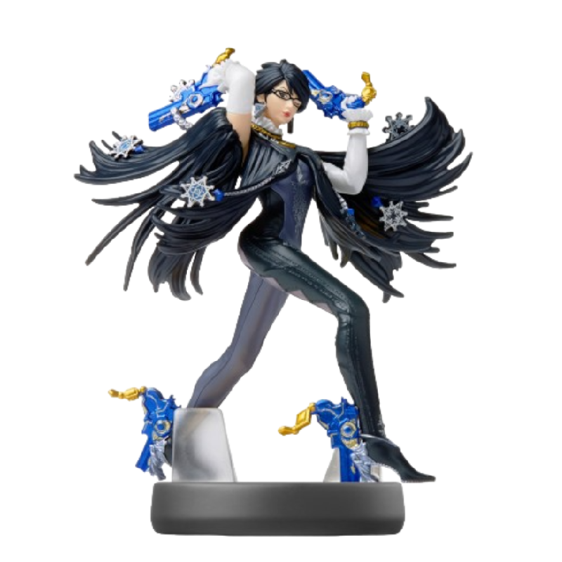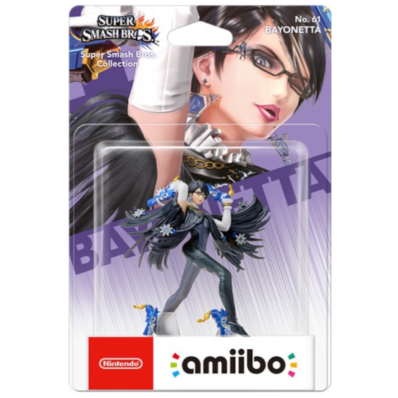 A figura Amiibo Super Smash Bros de Bayonetta (número 61), apresenta a personagem em uma pose poderosa e dinâmica. Vestida com um elegante vestido preto, Bayonetta tem cabelos longos e soltos, botas altas e carrega suas icônicas pistolas. O design captura sua personalidade sedutora e confiante, tornando-a um item atrativo para colecionadores.