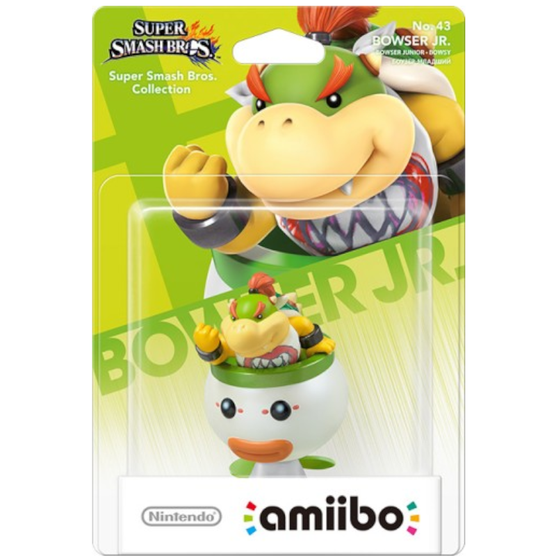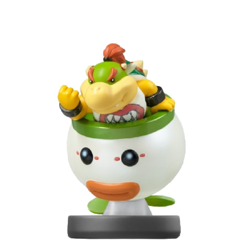 A figura Amiibo Super Smash Bros de Bowser Jr. (No. 43) captura a essência do personagem com detalhes precisos e vibrantes. Bowser Jr., o filho do vilão clássico Bowser, é representado em cima de sua “Clown Car”, um pequeno veículo voador em forma de palhaço que ele usa no jogo. Ele tem uma expressão determinada, com os dentes à mostra e uma sobrancelha franzida, refletindo seu caráter travesso e combativo.