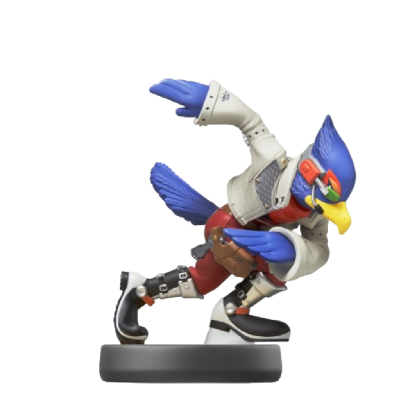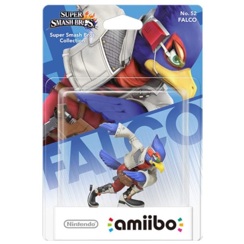 A figura amiibo Super Smash Bros do Falco (número 52) é uma figura esculpida com detalhes impressionantes, capturando a essência do personagem do jogo. Falco Lombardi, um dos icônicos lutadores da franquia Star Fox, é retratado em uma pose dinâmica, como se estivesse pronto para entrar em combate. Ele é apresentado com seu característico traje azul e vermelho, que inclui uma jaqueta e um colarinho alto, complementado por um cinto e botas detalhadas.