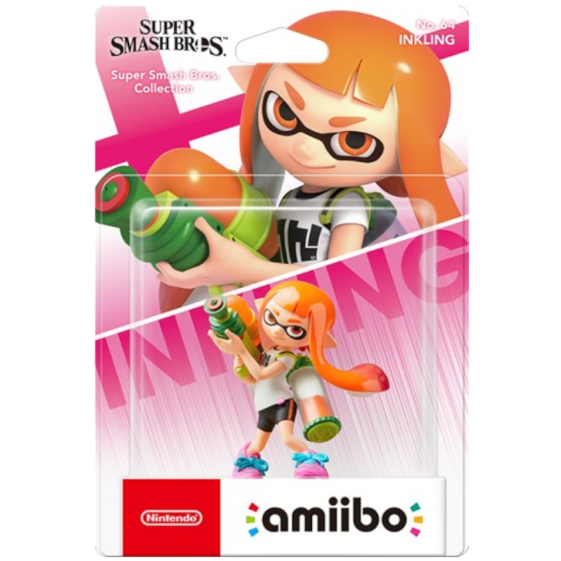 A figura amiibo Super Smash Bros de Inkling (No. 64) apresenta um Inkling em pose dinâmica, pronto para lançar tinta. Com pele clara e cabelo laranja em estilo moicano, a figura segura uma pistola de tinta detalhada em azul e verde.