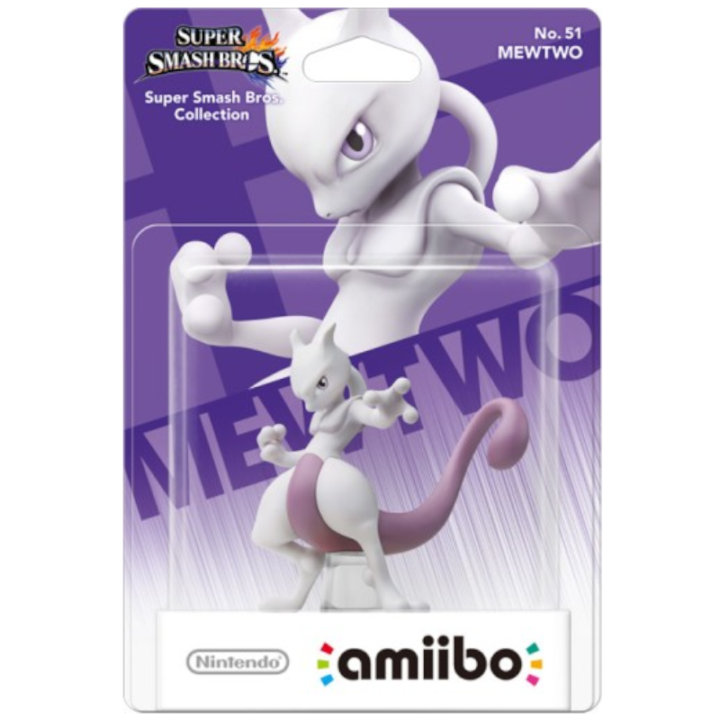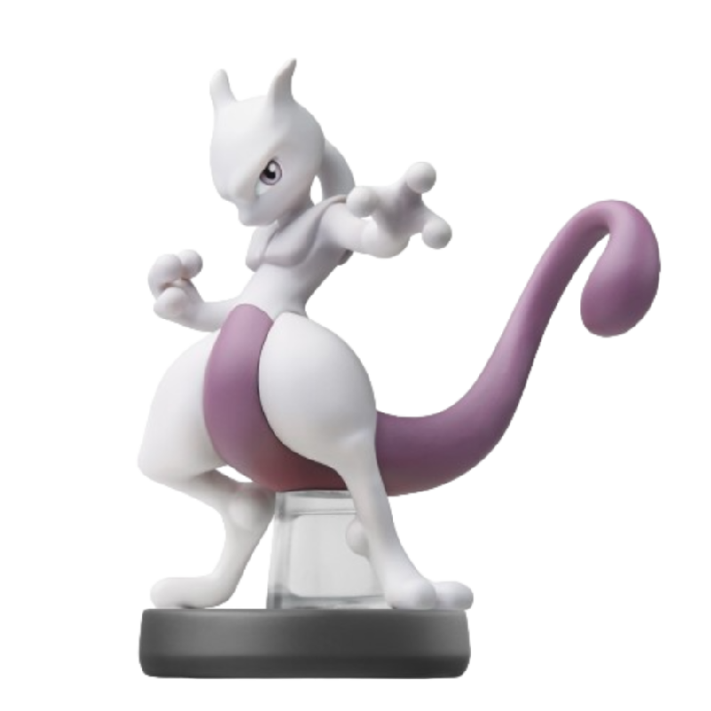 A figura amiibo Super Smash Bros de Mewtwo é uma figura estilizada do icônico Pokémon. Ele está posicionado em uma pose dinâmica, com uma das mãos levantadas, demonstrando seu poder psíquico. A figura apresenta detalhes vibrantes, com uma coloração predominante em lilás e roxo, além de toques de azul e rosa nas partes mais claras do corpo. Seus olhos são expressivos, destacando seu caráter enigmático. Mewtwo tem uma cauda longa e elegante que se curva para trás, e suas pernas são robustas, proporcionando estabilidade à figura. A base do amiibo é circular e preta, típica dos amiibos, e exibe o logotipo da série Super Smash Bros.