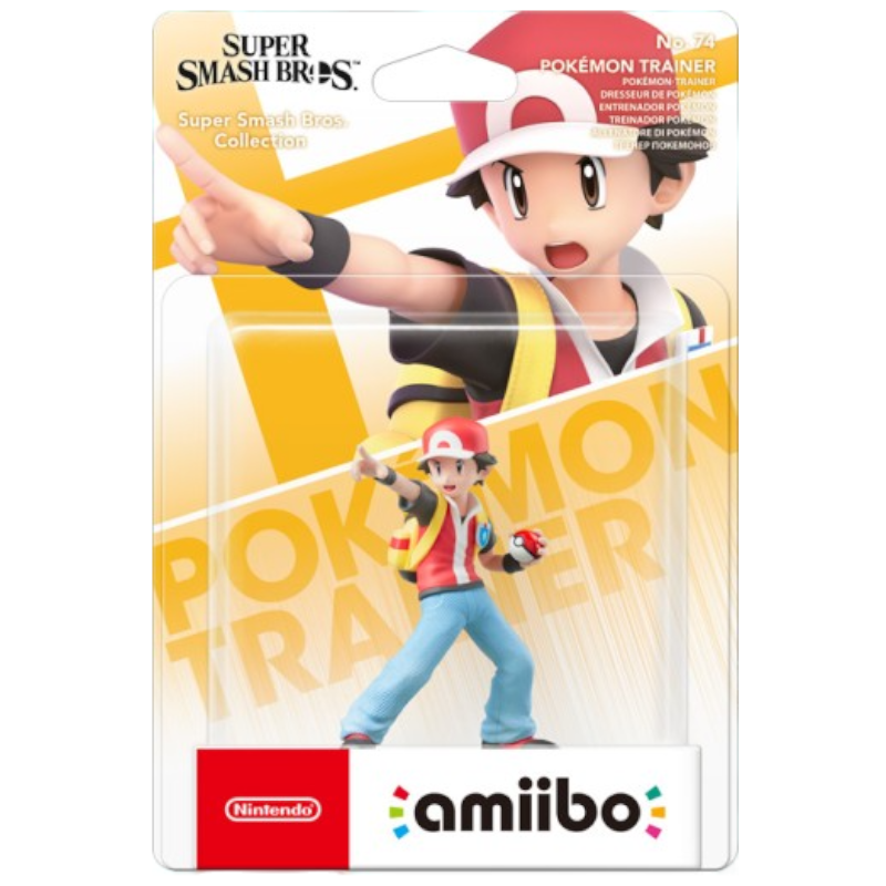 A figura Amiibo Super Smash Bros de Pokémon Trainer (No. 74) é uma figura que representa um treinador de Pokémon, que se destaca por seu design colorido e dinâmico. O Trainer é retratado em uma pose de batalha, com um braço levantado, como se estivesse prestes a lançar um Pokémon. Ele usa um boné vermelho e uma camiseta azul, complementados por calças verdes e tênis brancos.
