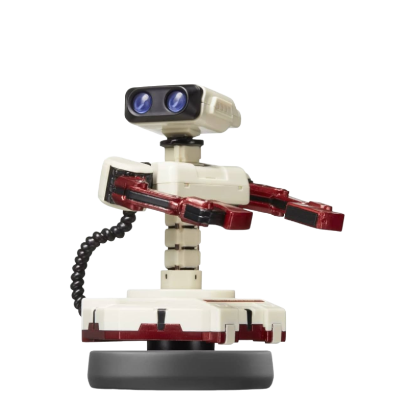 A figura amiibo Super Smash Bros do R.O.B apresenta um design retrô dos anos 80, com um corpo cinza claro e detalhes em azul e vermelho. Seu rosto cilíndrico possui dois olhos brilhantes que transmitem uma expressão amigável. Os braços articulados reforçam a aparência mecânica do robô, enquanto a base circular destaca o logotipo de Super Smash Bros. A figura é cuidadosamente esculpida e polida, tornando-se uma peça atraente para colecionadores e fãs do jogo.