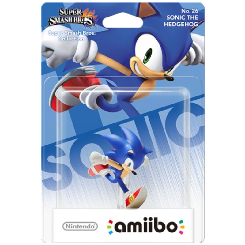 A figura Amiibo Super Smash Bros do Sonic (número 26), retrata o famoso personagem em uma pose dinâmica, refletindo sua velocidade. Com um design vibrante, Sonic é principalmente azul, possui um rosto expressivo, olhos grandes e um sorriso. Ele veste luvas brancas e sapatos vermelhos, e a base da figura é sólida, destacando a qualidade da escultura e pintura, tornando-a um item atraente para colecionadores e fãs de videogames.