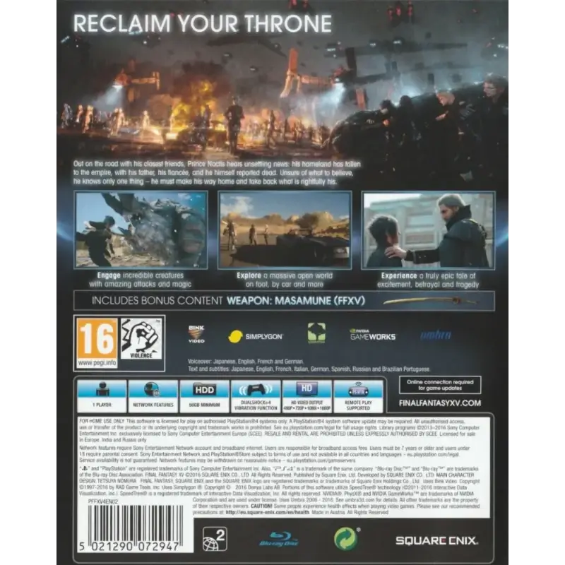 Final Fantasy XV (Day One Edition) PS4 é um RPG de ação e aventura em mundo aberto, acompanhando Noctis em sua jornada épica para recuperar o trono e enfrentar Niflheim.