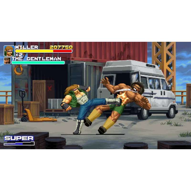 A jogabilidade traz a experiência arcade clássica, com combate rápido, combos poderosos e a possibilidade de enfrentar ondas de inimigos em cenários urbanos cheios de detalhes, como metrôs, becos e clubes noturnos. Os visuais lembram os sprites pixelados característicos da era 16-bits, mas com uma fluidez moderna. A trilha sonora, fortemente inspirada em músicas de rave e techno britânico dos anos 90, reforça a atmosfera de luta nas ruas.