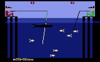 No Fishing Derby, o seu objectivo é ser o primeiro de dois jogadores a apanhar 99 libras de peixe. Cada jogador está numa doca na parte superior do ecrã, e controla a linha de pesca na água. Ao mover a linha de pesca para cima ou para baixo, pode apanhar os peixes que estão a nadar. Quanto mais fundo se desce, maiores são os peixes. Quando se apanha um peixe, é preciso apanhá-lo a sério! Para tornar o jogo mais difícil, um tubarão está constantemente a nadar para trás e para a frente. Se tiver um peixe na sua linha e ele tocar no tubarão, o tubarão comê-lo-á e depois terá de apanhar outro peixe. Estão disponíveis dois níveis de dificuldade, e o jogo pode ser jogado por uma pessoa contra o computador ou dois jogadores um contra o outro.