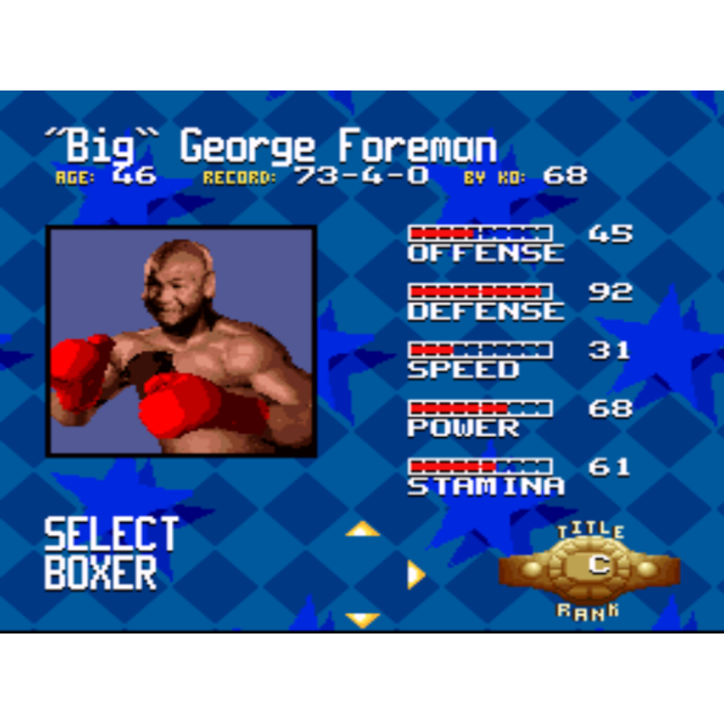 Antes de comercializar churrasqueiras para redução de gordura, a lenda do boxe George Foreman endossou este jogo de boxe com uma visão de terceira pessoa semelhante a Punch Out. Uma gama completa de socos e jabs está disponível, com pontuação completa rodada por rodada dos juízes. 3-12 rodadas e há 2 visualizações de câmera, bem como uma opção de troca automática.
