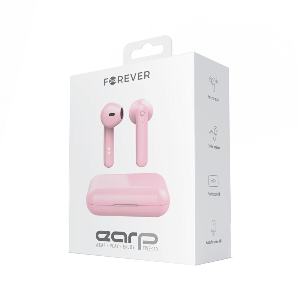 Fones de ouvido Forever TWE-110 Earp Bluetooth com estojo de carregamento rosa.