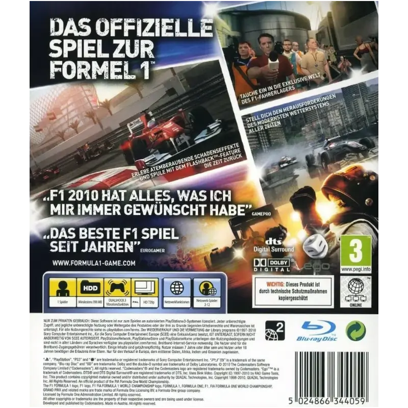 F1 2010 é um jogo de corridas com a licença oficial de fórmula 1: Apresenta todos os carros, condutores, percursos e regras da época de 2010. O jogo concentra-se claramente no aspeto da simulação, mas existe também um modo arcade para jogadores menos experientes.