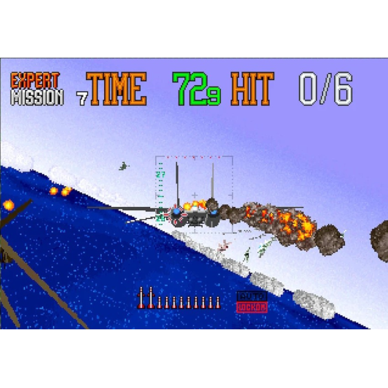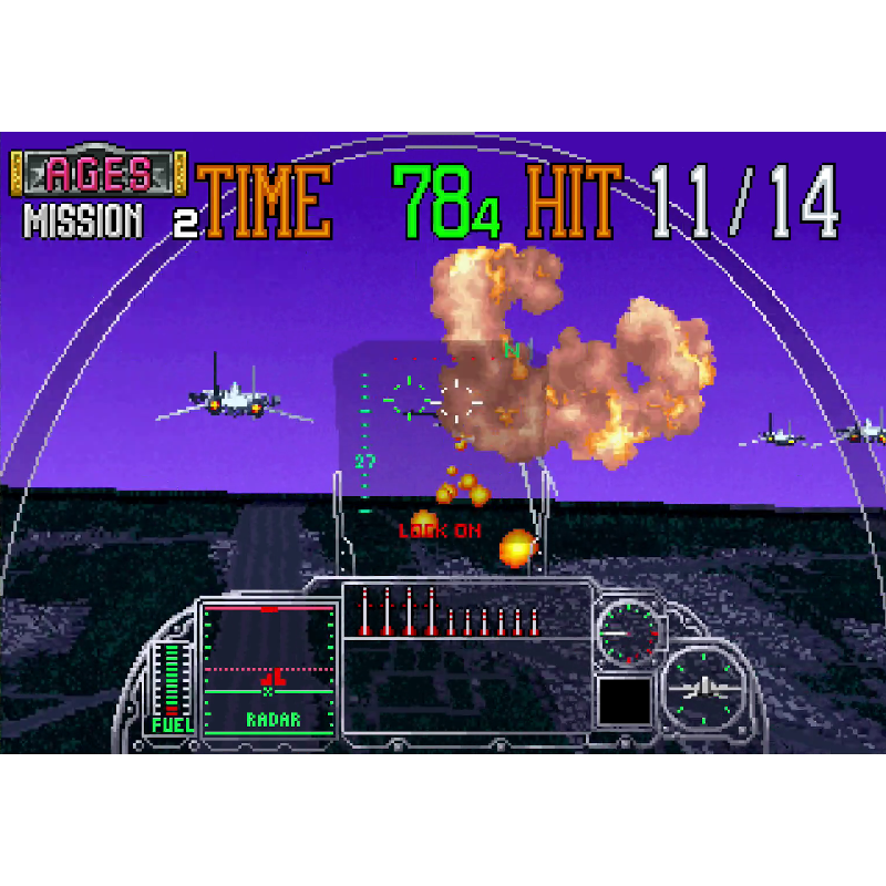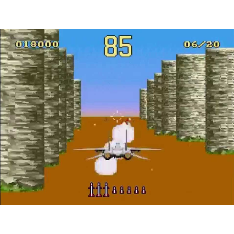 O jogo é dividido em 8 estágios, que são divididos em sub-estágios em terra e mar, cada um com um limite de tempo estrito e um número alvo de aviões para abater. Eles ocorrem atrás do seu avião, que podem ser controlados com ‘para cima’ referindo-se a ‘subir’ ou ‘mergulhar’, dependendo da preferência do jogador. Você está armado com 10 mísseis, bem como armas padrão. O avião pode sobreviver a alguns golpes, então observe o relatório de danos conforme ele vai do vermelho ao preto.