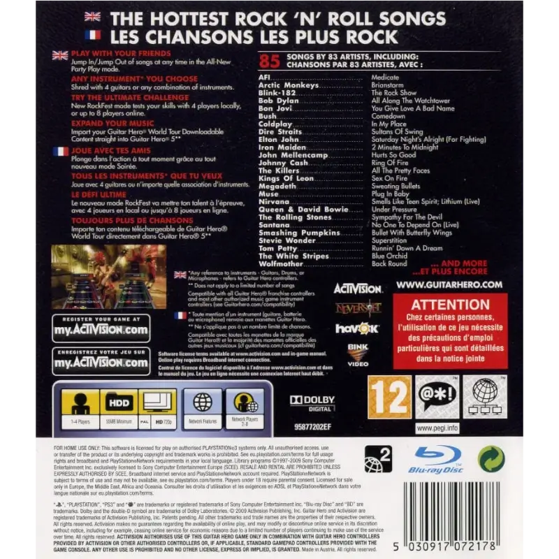 Ao lado de uma nova banda sonora com 85 canções, muitos vocalistas animados são agora modelados depois de músicos famosos como Johnny Cash, Carlos Santana, Shirley Manson, Kurt Cobain, e Matthew Bellamy. Os jogadores ainda podem compor as suas próprias canções no estúdio incluído e o jogo depende muito do conteúdo descarregável, através de faixas e álbuns completos. Uma parte das canções do Guitar Hero: World Tour, Guitar Hero Smash Hits e Band Hero pode ser importada em troca de uma pequena taxa por canção.