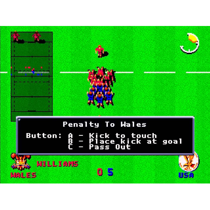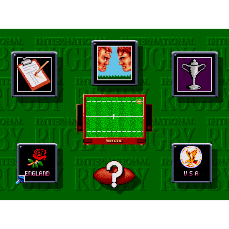International Rugby é um jogo de rugby jogado de uma perspectiva de cima para baixo. O jogo consiste em partidas de torneio disputadas como parte da copa do mundo com países como Inglaterra, EUA, Argentina, França, País de Gales, Escócia, Fiji etc. Nas opções, o tipo de torneio pode ser determinado, juntamente com a quantidade de vento e comprimento correspondente. Multiplayer é suportado para dois jogadores.