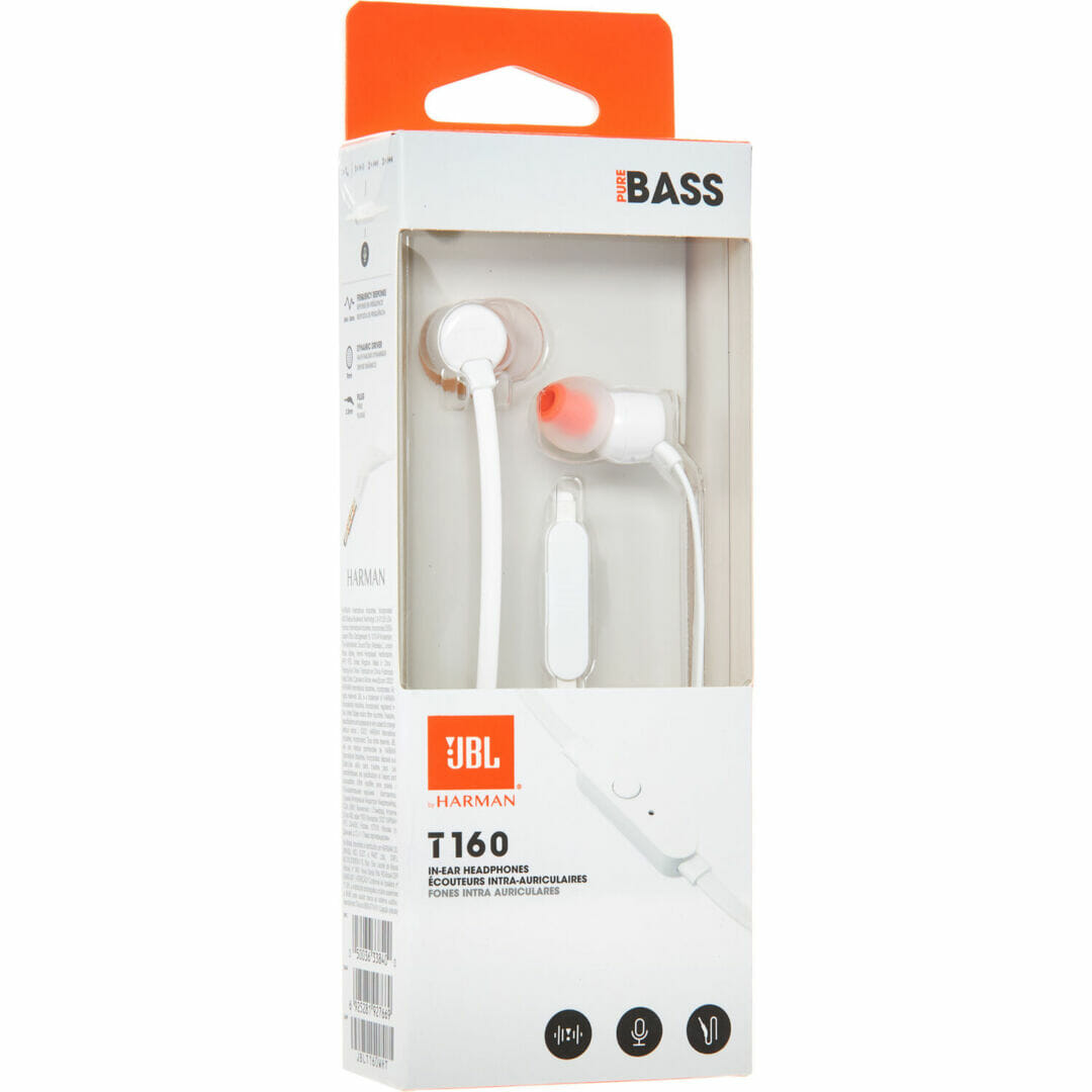 JBL TUNE 160. Tipo de produto: Auscultadores. Tecnologia de conetividade: Com fios. Frequência dos auscultadores: 20 – 20000 Hz. Cor do produto: Branco – Jbl