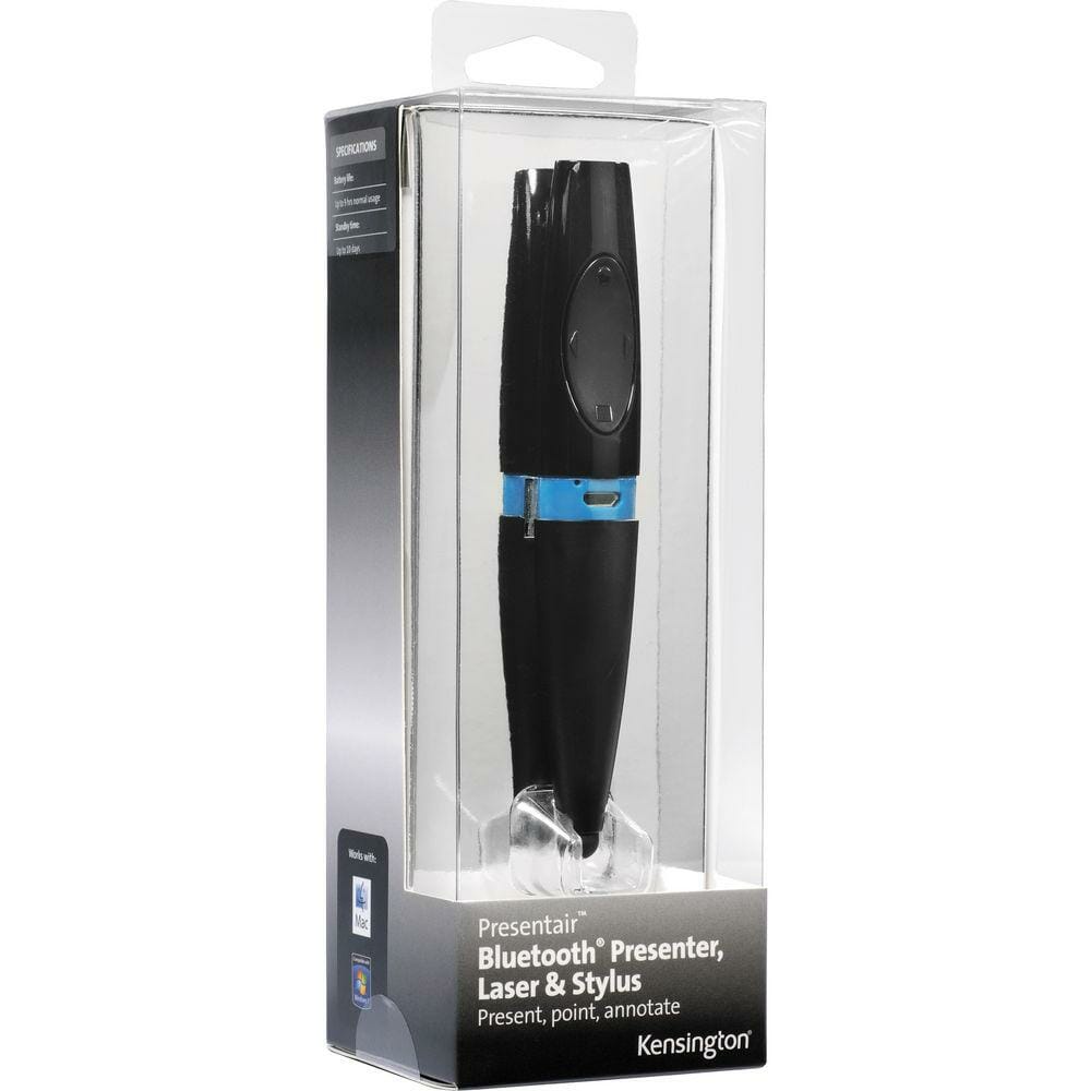O Kensington Presentair Bluetooth Presenter, Laser & Stylus é uma ferramenta de apresentação versátil que desliza facilmente para dentro de um bolso de camisa para guardar em segurança. Quando estiver pronto a utilizá-lo, o apresentador incorporado apresenta controlos intuitivos de 4 botões que permitem o controlo para a frente e para trás do software de apresentação PowerPoint e Keynote, sem necessidade de controladores. Há também um poderoso ponteiro laser vermelho para o ajudar a ilustrar o seu ponto e um botão para uma opção de ecrã em branco. O Presentair comunica com o seu portátil via Bluetooth a uma distância de até 30 pés.