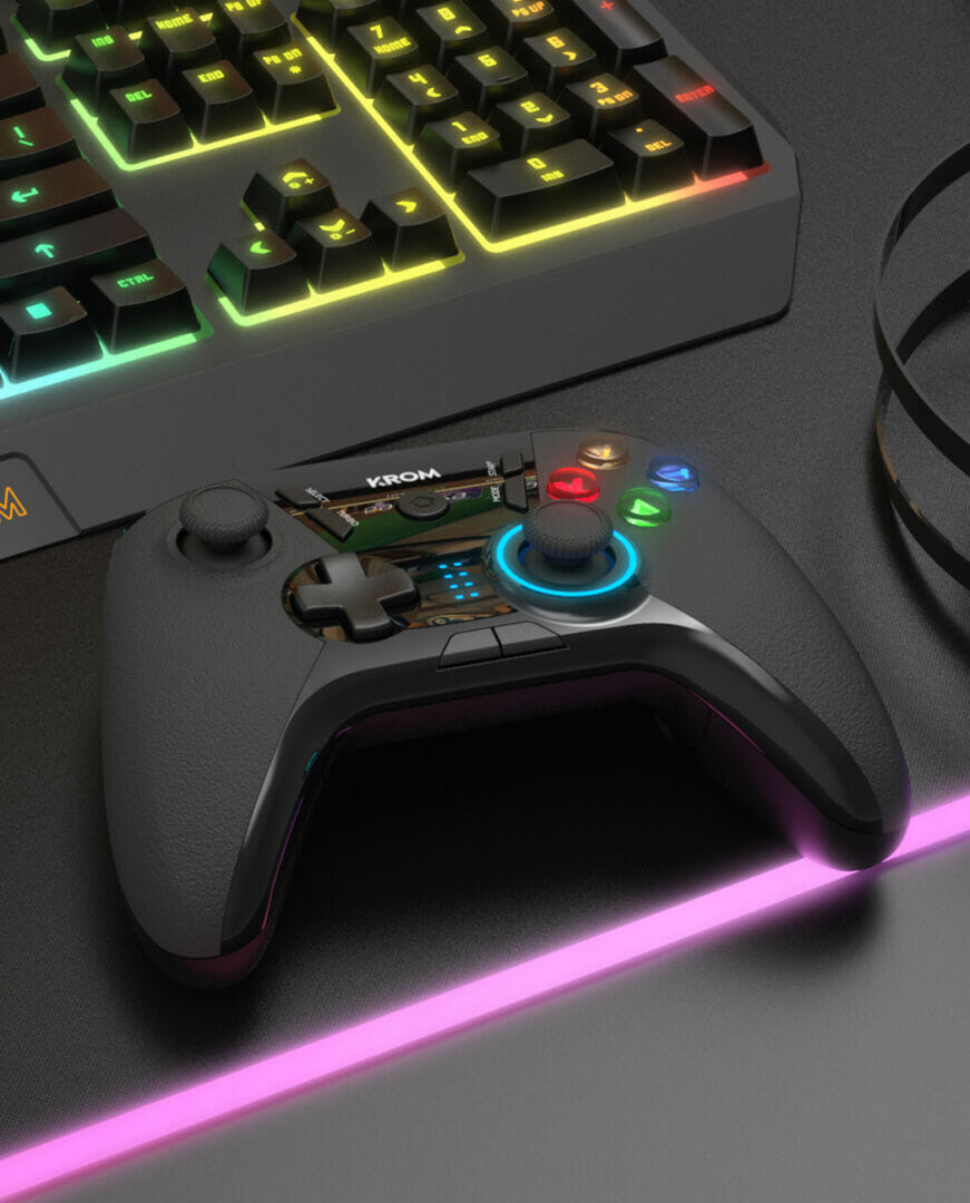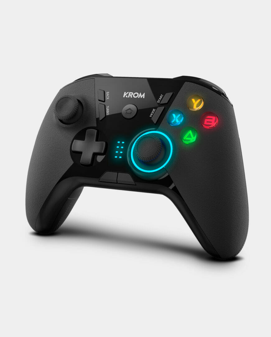 Muito fácil de instalar e muito fácil de emparelhar com os diferentes dispositivos via Bluetooth, o Krom Kloud tem patilhas traseiras configuráveis . Inclui o pad com as quatro setas clássicas à esquerda e os botões Voltar, Iniciar e Modo que acompanham o logotipo, abaixo dos quais também encontramos o botão Início. Em redor do logo também está o útil Turbo, que atua pressionando um botão repetidamente, podendo associar esta função a um dos botões A, B, X, Y, LB, RB, LT e RT. Torna-te invencível no campo de batalha.