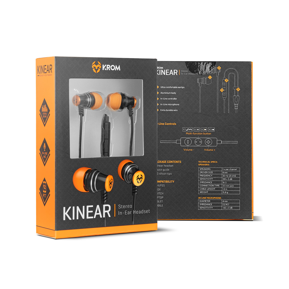 Krom Kinear são uns auriculares ergonómicos com alta compatibilidade, que oferecem excelente qualidade de som surround e cujo microfone e controlo integrados permitem que faças chamadas ou comuniques durante um jogo, com grande fluência. Construídos em metal, estes auriculares com fio são perfeitos para todos os tipos de dispositivos, e são muito fáceis de usar com uma grande durabilidade