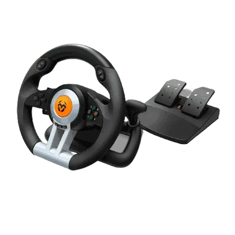 Tem uma rotação angular de 180º que lhe permitirá fazer curvas incríveis e experimentar uma verdadeira sensação de condução de uma forma divertida, graças ao seu acabamento em tecido sintético que lhe oferece uma maior estabilidade, bem como efeitos de vibração que trazem um toque de realismo à sua experiência no asfalto.